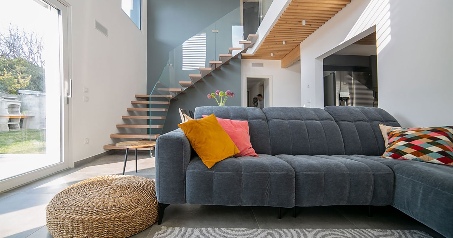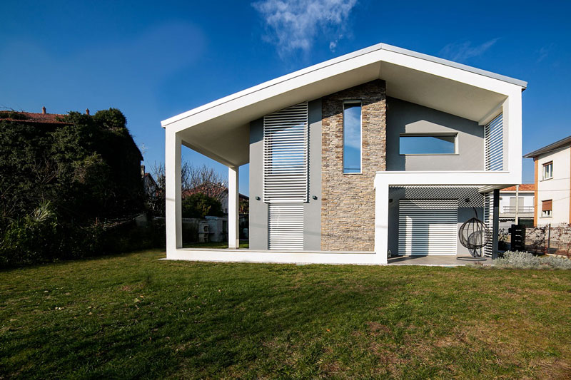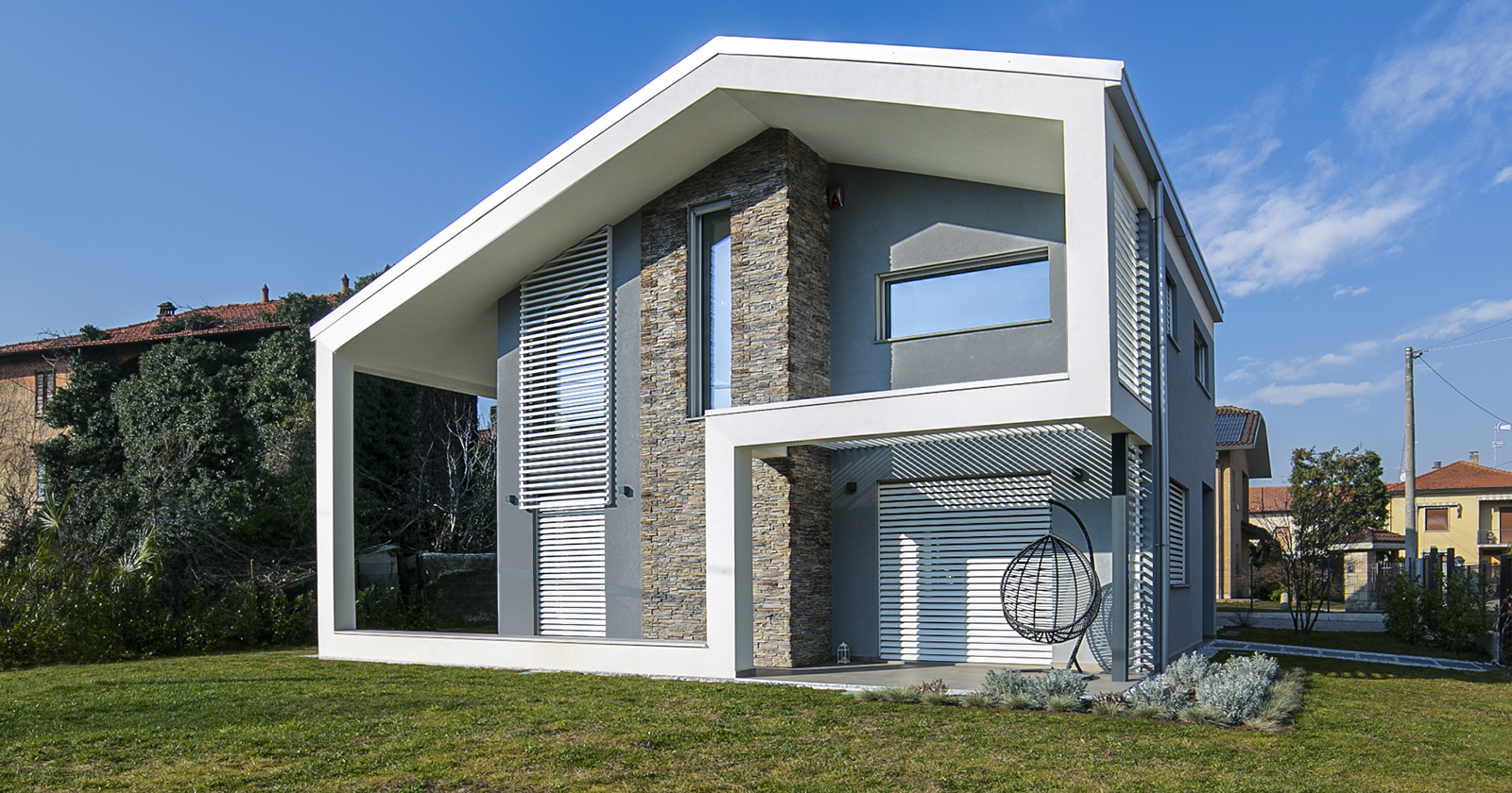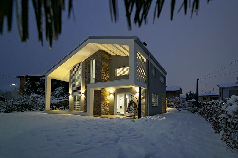 La casa realizzata a Tradate, terminata nel 2020, presenta una struttura a telaio prefabbricato in legno ed è stata ingegnerizzata, prodotta e installata da Marlegno.