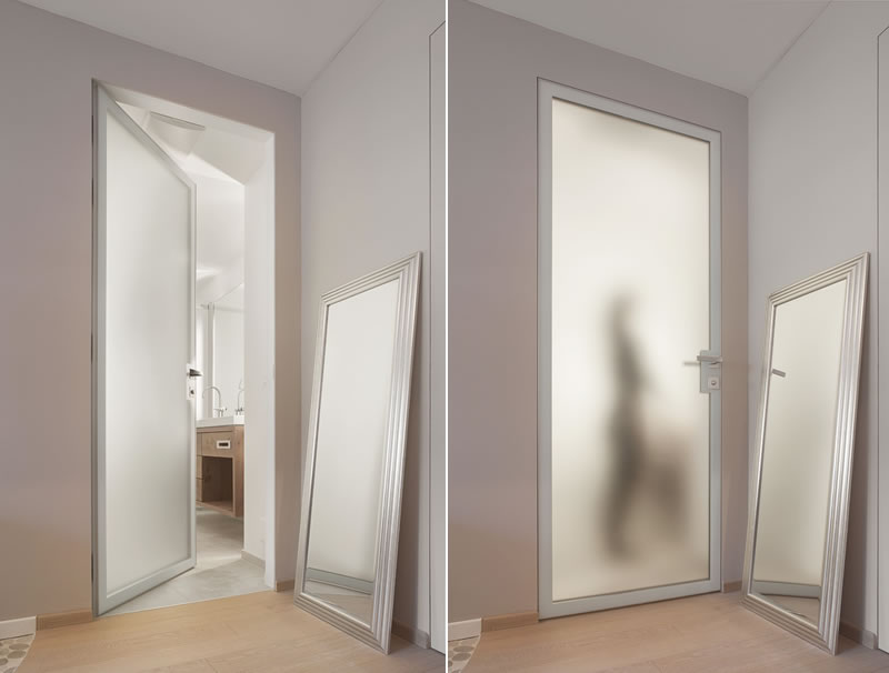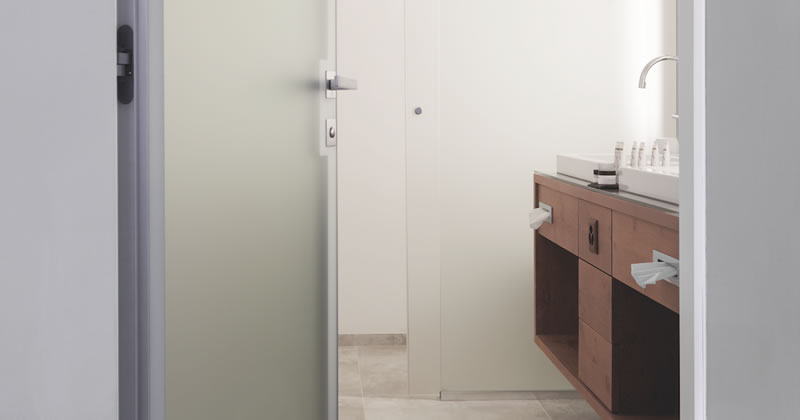 L’alluminio, materiale leggero e luminoso, è utilizzato per integrare armoniosamente maniglia e sistema di chiusura mentre all’interno del pannello porta, la scelta del vetro satinato favorisce il passaggio della luce naturale e non, preservando al tempo stesso la privacy di chi è all’interno.