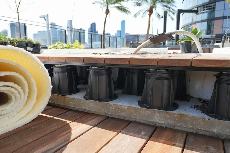 La necessità di impiegare un sistema ad alte prestazioni ha orientato la scelta verso soluzioni in grado di coniugare flessibilità di posa, velocità di installazione e resistenza nel tempo. Sono stati utilizzati oltre 3.500 supporti Pedestal Prime® – in particolare il modello PR1, regolabile da 30 a 65 mm – caratterizzati da prolunga integrata, che elimina la necessità di componenti aggiuntivi. Un dettaglio tecnico che ha semplificato notevolmente logistica, stoccaggio e tempi di posa, aspetto rilevante per le aree soggette a traffico pedonale intenso e destinate all’uso pubblico.