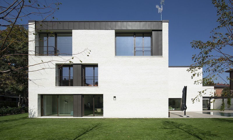 La casa interpreta in chiave contemporanea il rapporto tra memoria rurale e città diffusa contemporanea, trasformando un vincolo urbano in occasione compositiva. Ne deriva un’architettura unitaria ma dinamica, capace di dialogare con la tradizione costruttiva emiliana attraverso una precisa composizione delle facciate e grazie alla scelta di utilizzare per tutto il volume il mattone facciavista Dogi 2.0 scialbato SanMarco di wienerberger.