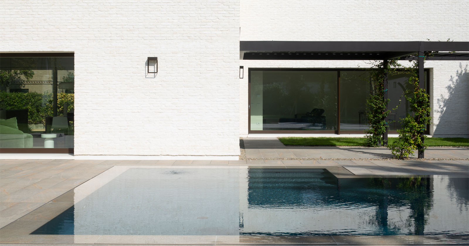 Sul lato sud, affacciato sul giardino, l’architettura cambia registro e si apre alla dimensione privata dello spazio esterno. Qui si sviluppa il sistema del solarium e della piscina, fulcro della vita familiare all’aperto. Le geometrie diventano più nette, prive di sporti di gronda, mentre ampie portefinestre orizzontali mettono in relazione soggiorno e zona pranzo con l’esterno, concepito come naturale estensione dello spazio interno.