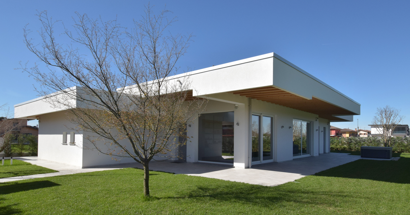 La casa è costituita da un unico piano terra, così che l’intorno sia non solo visivamente percepito ma fisicamente vissuto con semplicità e naturalezza. L’edificio è realizzato completamente in legno, tranne che per le fondazioni a platea, i marciapiedi esterni e una piccola trave in carpenteria metallica, parte strutturale dell’aggetto che caratterizza la casa. Il legno è lasciato a vista anche nelle parti esterne, come il solaio del porticato, trattato con cura da Marlegno.