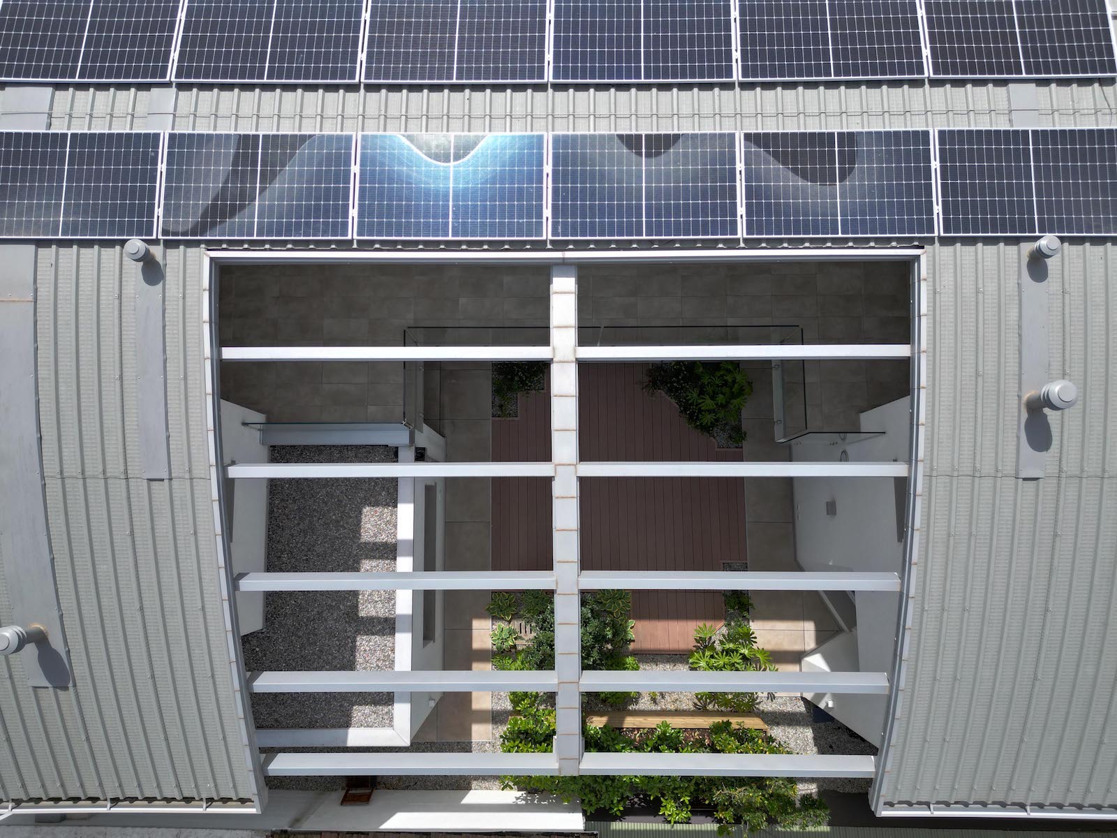 L’abitazione si sviluppa su due livelli: al piano terra, un’ampia zona giorno; al primo piano, sono presenti le camere, collegate da un soppalco che attraversa il doppio volume del soggiorno. Il cuore del progetto è rappresentato da una corte interna, un patio verde attorno al quale si distribuiscono i vari ambienti della casa.
