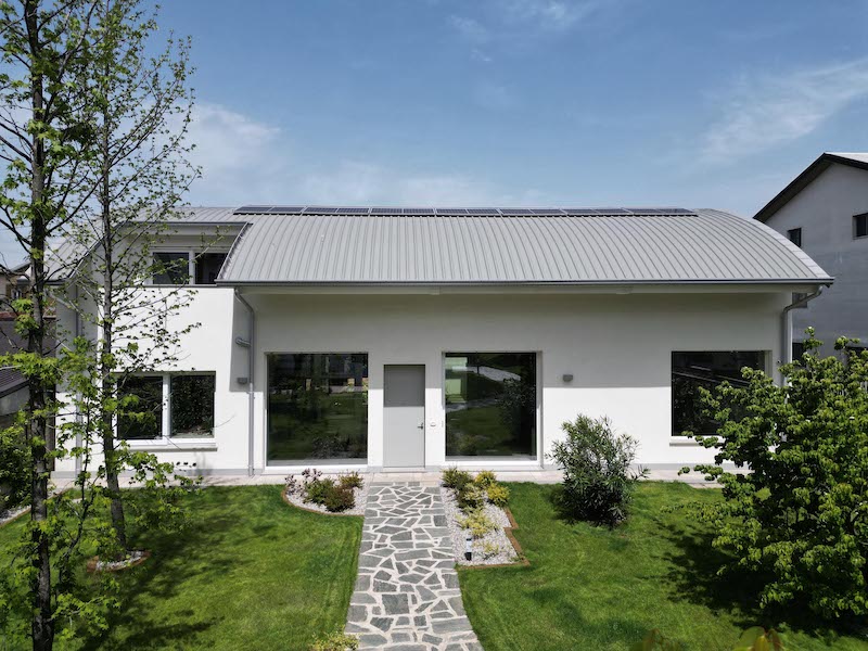 Progettata da Mauri & Grimoldi Associati, la villa è stata realizzata da Marlegno, su un sedime preesistente che ha influenzato forma e volumetria del nuovo edificio. Queste le parole dell’architetto Grimoldi che abbiamo intervistato: «L’edificio nasce su un lotto occupato in precedenza da un capannone dismesso, acquisito all’asta dalla committenza. Fin dall’inizio, i clienti hanno accolto con entusiasmo la sfida di realizzare un progetto fuori dagli schemi: una casa che riprende formalmente il volume originario del capannone, per sfruttarne appieno le potenzialità volumetriche. Un’idea non frequente nel contesto residenziale, che ha dato vita a una casa non convenzionale, riconoscibile per la sua copertura curva e la sagoma industriale reinterpretata».