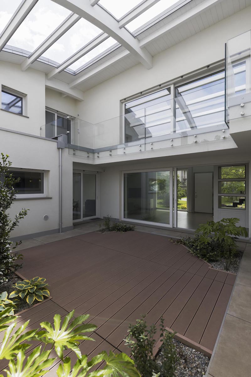 Questa soluzione nasce non solo da una volontà compositiva, ma anche da precise esigenze tecnico-normative: il lotto era infatti molto largo e profondo, e la vicinanza del fronte nord ad altri edifici rendeva difficile ottenere i corretti rapporti aero-illuminanti. Creando un patio centrale, è stato possibile garantire luce naturale, ventilazione e privacy a tutti gli ambienti, oltre a un affaccio interno verde e protetto, coperto da un’alta volta a botte in legno. La copertura, con il suo disegno di travi curvilinee, restituisce un’idea di protezione e unicità, oltre a evocare con discrezione l’identità del fabbricato industriale che l’ha preceduta.