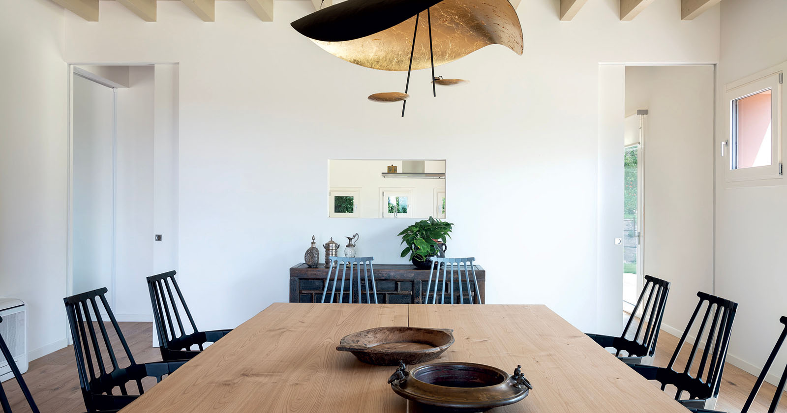 La distribuzione si avvale delle porte a scomparsa filomuro Eclisse Syntesis Line, prive di stipiti, che hanno permesso di creare suggestive prospettive fra gli ambienti e con gli spazi esterni.