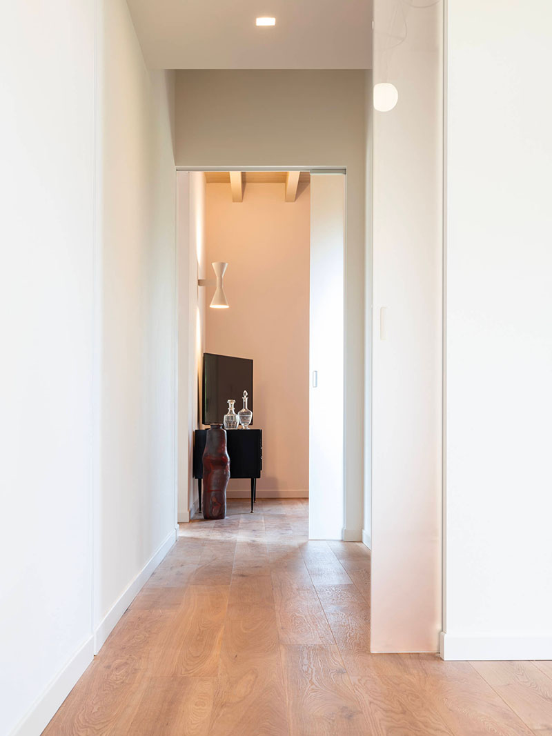 La scelta delle soluzioni Eclisse scorrevoli a scomparsa e a battente filomuro secondo lo spazio e le sue esigenze ha permesso di creare luoghi flessibili per l’uso ricettivo, sia per i gruppi di amici che per le famiglie.