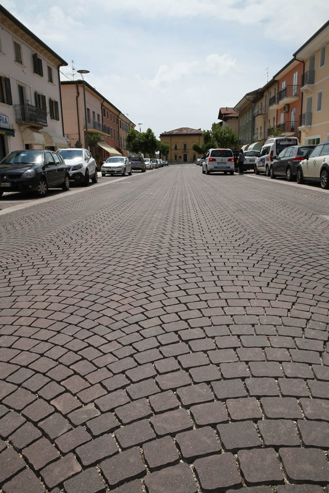 Nel progetto è stato conservato l’assetto originario della strada a schiena d’asino con caditoie laterali. Si è scelto di rifare completamente la fondazione stradale, effettuando uno scavo di circa 80 cm molto difficoltoso per la presenza di sottoservizi. la stratigrafia che costituisce la nuova massicciata stradale è la seguente: geotessuto da 500 sopra terra naturale, 40/50 cm di riciclato di cava drenante, 15/20 cm di stabilizzato, 4/6 cm di spuntina sulla quale sono stati posati gli autobloccanti Via del Centro®. I circa 2000mq2 di Via del Centro colore tirolo, finitura adige sono inframezzati da attraversamenti pedonali colore granito, finitura granitica e da inserti in pietra di prun producendo una gradevole alternanza. Le fughe sono poi state chiuse con sabbia silicia.