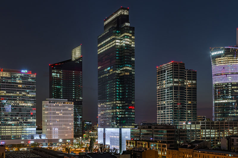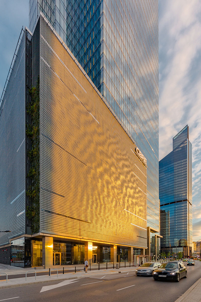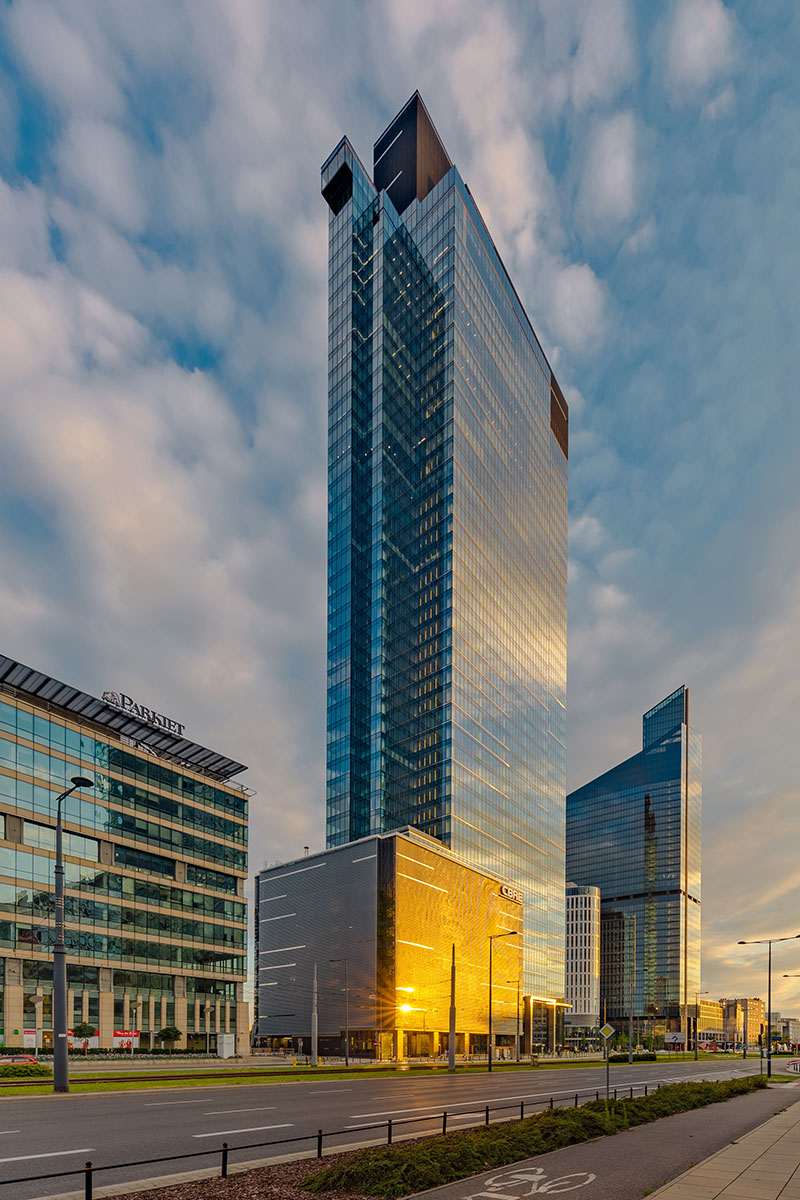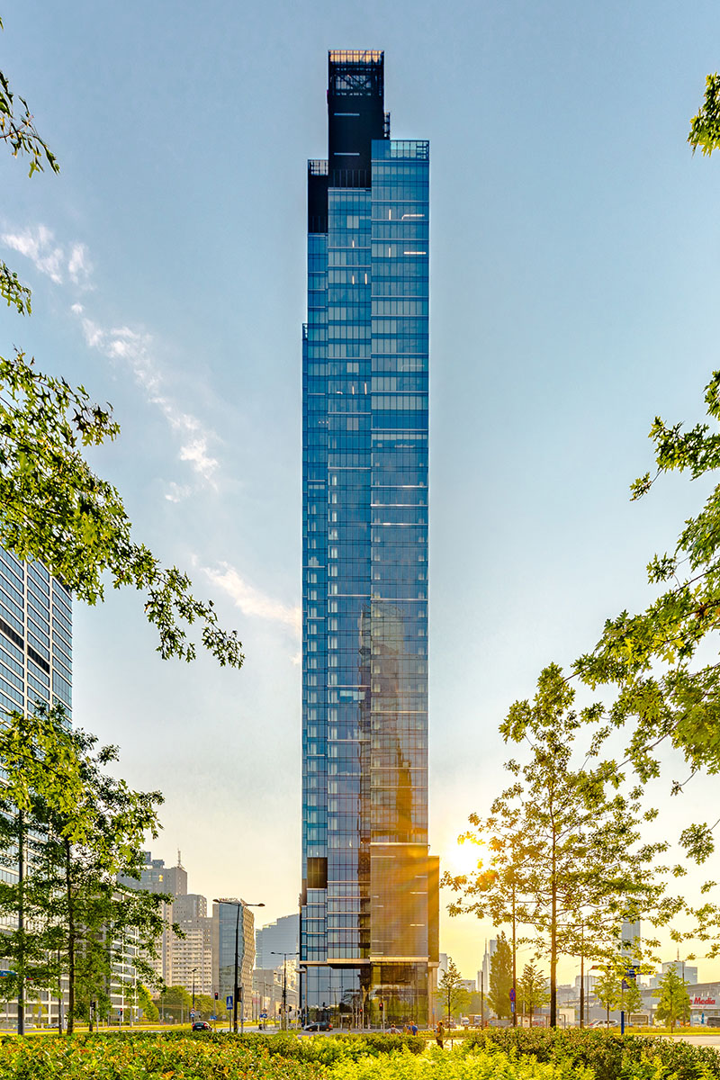 La sua architettura, con una struttura snella e affusolata che riflette il contesto in cui è inserito, coniuga il patrimonio modernista della capitale polacca con materiali d’avanguardia.