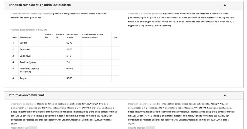 Il catalogo comprende prodotti da costruzione, prodotti impiantistici, arredi ed infine mezzi e attrezzature. Le informazioni sui prodotti sono complete di schede tecniche – collegate agli oggetti BIM – e dati prestazionali, con un’attenzione particolare verso gli aspetti legati alla sicurezza, all’efficienza energetica e alla sostenibilità ambientale. La volontà è quella di fornire informazioni utili e precise non solo sul prodotto, ma sul suo intero ciclo di vita; sono presenti infatti anche delle sezioni dedicate all’installazione o posa in opera, al trasporto, alla movimentazione, alla manutenzione e alla dismissione dei singoli elementi.