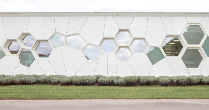Scaglie romboidali 44x44 Prefa posate senza soluzione di continuità fra fronti e copertura plasmano un edificio monolitico che dialoga con l’intorno cittadino