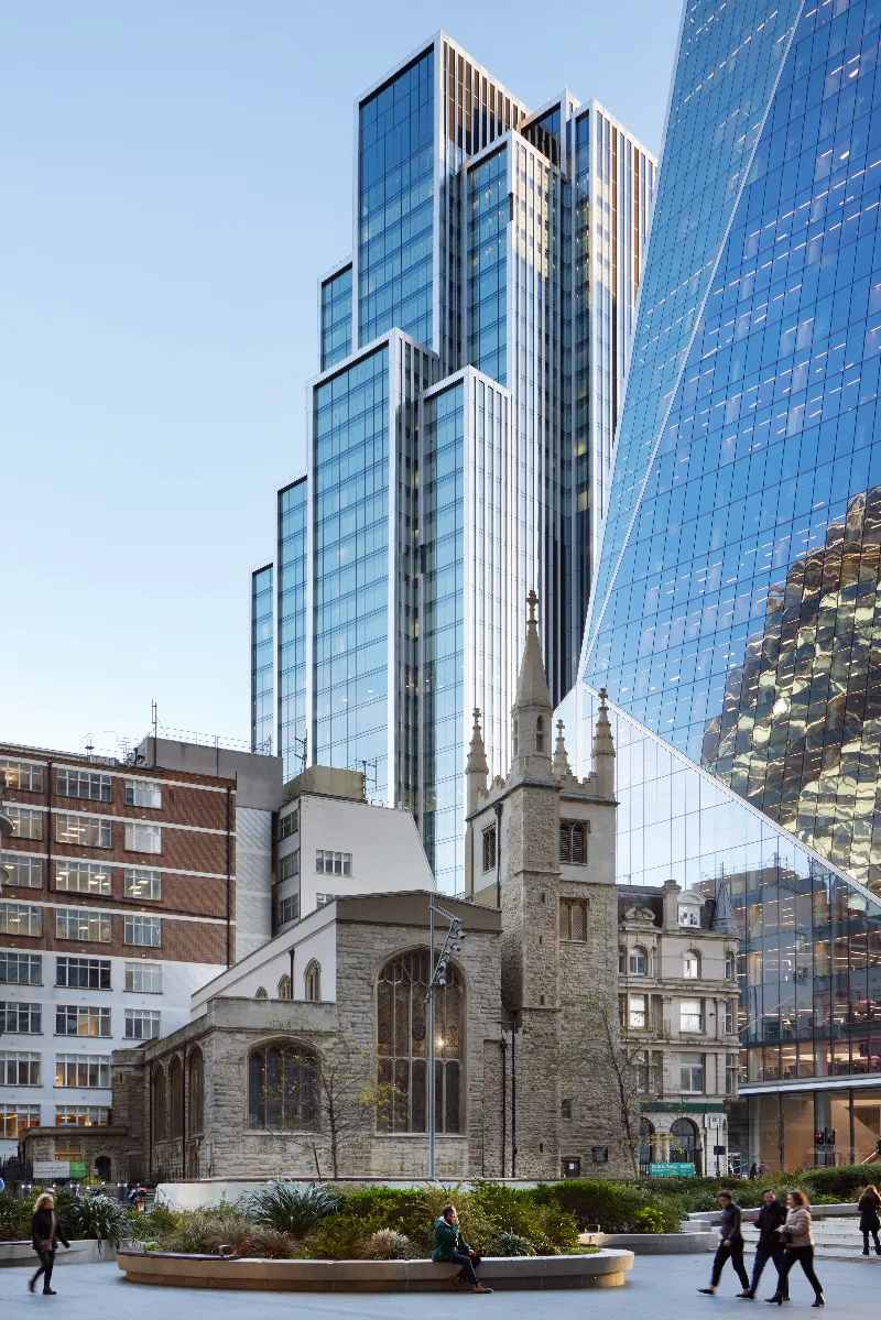 L’edificio – caratterizzato da due torri che si elevano su una piattaforma condivisa – offre 85.000 m² di spazi destinati a oltre 10.000 utenti e si distingue per l’equilibrio tra design, funzionalità e responsabilità ambientale. L’architettura, ispirata ai grattacieli americani dell’inizio del XX secolo, si articola in volumi verticali che variano da 34 piani alla fine di Leadenhall Street a 7 piani verso il Tamigi, collegati da 17 terrazze panoramiche a diverse altezze. Oltre agli uffici, il complesso ospita ristoranti, bar, una suite benessere, un circolo sportivo, spazi per eventi e una spettacolare hall su due livelli, con atrio verde. A livello del suolo, l’edificio si allontana dai confini del sito, creando nuovi spazi pubblici con generosi percorsi pedonali. Il progetto ha inoltre integrato e valorizzato strutture storiche preesistenti, tra cui il Billiter Building, edificio “Grade II” del XIX secolo, oggi parte del nuovo complesso.
