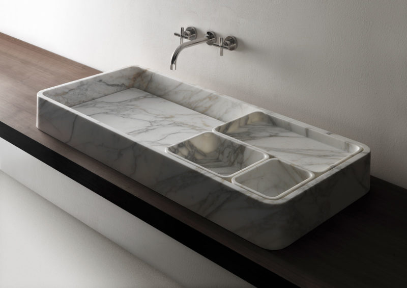 Con profondità diverse, sono stati disegnati come ‘contenitori’ di varie misure, sempre a matrice rettangolare, e sono facilmente estraibili, intercambiabili, utilizzabili a diretto contatto con l’acqua o, – a seconda del posizionamento della rubinetteria -, come vassoi in cui collocare il sapone o riporre i propri accessori bagno. Lo scarico è completamente celato da uno di essi, che ne enfatizza ulteriormente il design lineare e contemporaneo, firmato da Matteo Nunziati. Proposto in una sola variante dimensionale, Bento è disponibile in nove tipologie di marmo.