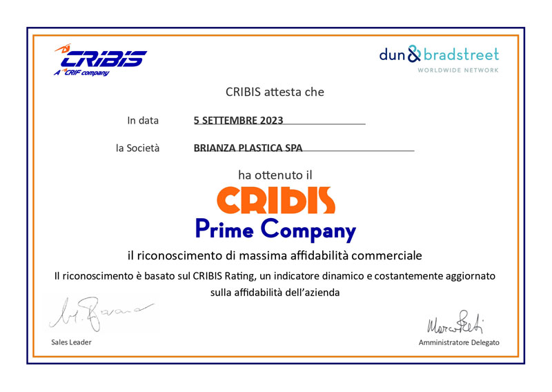 La certificazione CRIBIS Prime Company rappresenta per Brianza Plastica un prestigioso traguardo, la conferma del buon operato e delle scelte strategiche portate avanti dalla proprietà negli anni e un prezioso stimolo a mantenere saldi e costanti nel tempo i risultati di credibilità, affidabilità e solidità, che oggi hanno valso l’assegnazione di questa autorevole certificazione.