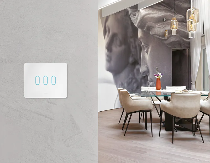 - Pills Smart 44 Touch, dove per azionare il comando basta semplicemente sfiorare la superficie in Corian®. Un tocco è sufficiente per introdurre un nuovo concetto di interruttore, elegantemente celato dietro la placca; nelle versioni da 3 e 4 posti.