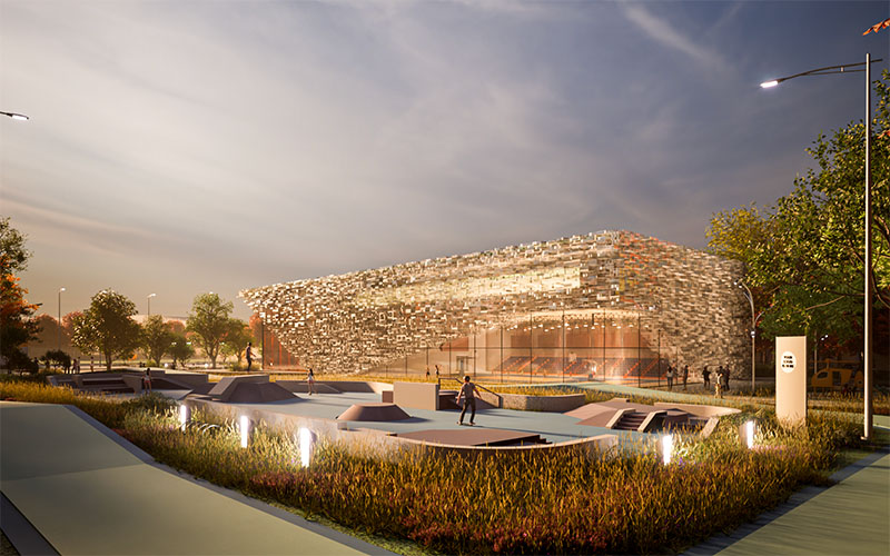 L’intervento non si limita alla costruzione della palestra ma include anche un parco, uno skatepark, un campo da calcio ed un’area parcheggi, tutte le aree funzionali sono collegate tra loro da percorsi pedonali e ciclabili che garantiscono un accesso sicuro e agevole. Questo layout promuove una visione integrata dello spazio pubblico, dove sport e natura si fondono in un ambiente vivibile e inclusivo.