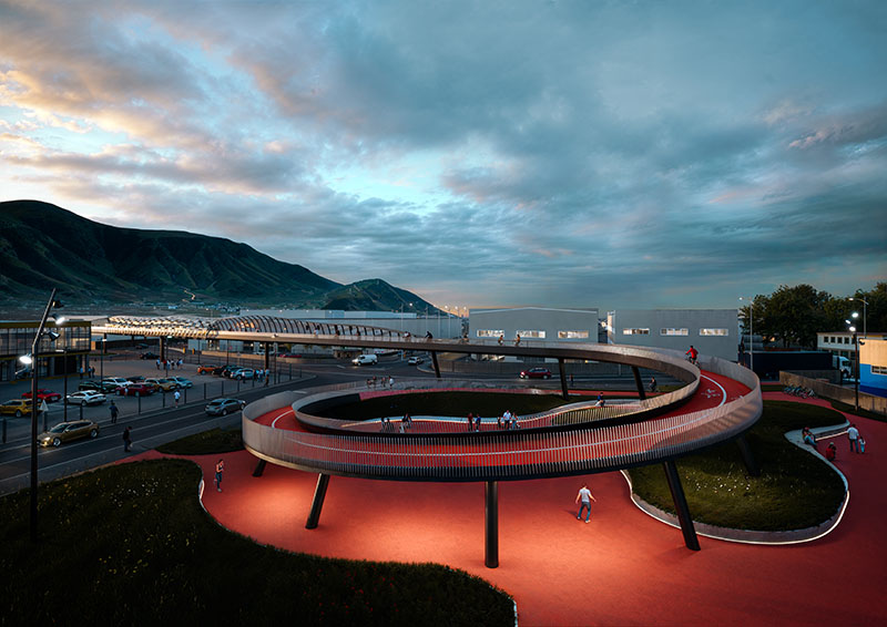 La barriera rappresentata dall’asse autostradale viene superata attraverso una pista che, sopraelevata rispetto alla strada, offre un percorso sicuro per pedoni e ciclisti lontano dal traffico della zona industriale e promuove una mobilità dolce capace di collegare visivamente e fisicamente le diverse parti della città.