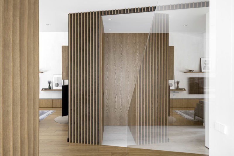 Le modifiche sono evidenti non appena si varca la soglia d‘ingresso. Tra la porta principale e il soggiorno, l’architetta ha creato una sorta di cubo che attraversa la pianta in diagonale, all‘interno del quale ha ricavato un grande armadio. Il suo volume è enfatizzato da dettagli in legno fresato su un lato e da una pittura decorativa scura sull’altro. Legno, intonaco e cemento sono i tre elementi che vengono accostati e riproposti in tutta la casa. I dettagli e i colori degli interni sono pochi, ma hanno sempre una forte funzione decorativa.