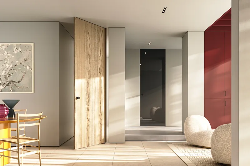 Questo innovativo sistema a bilico è disponibile nelle nuances delle palette bio di FerreroLegno Iride e ULTRAopaco oltre che nella finitura laccato lucido e in grezzo predefinito così da potersi abbinare perfettamente al colore scelto per le pareti, trovando la sua collocazione ideale sia in ambienti contract che residenziali.