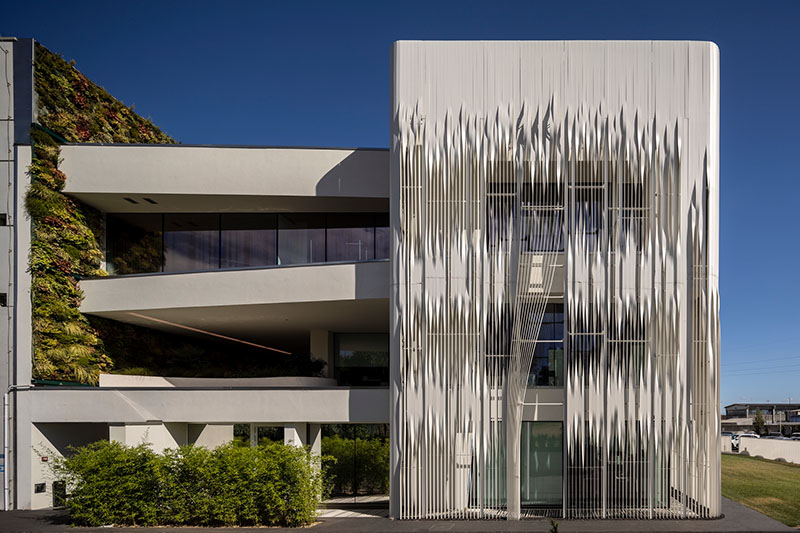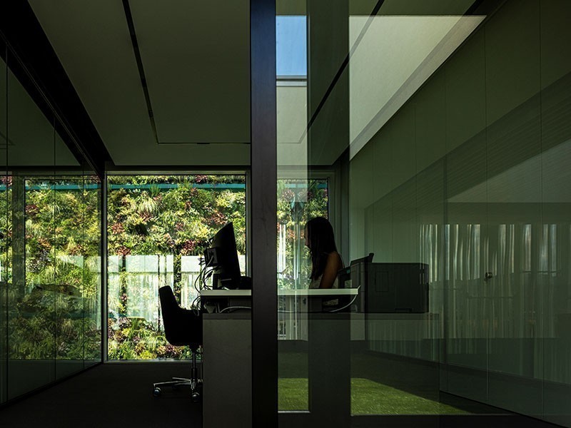 Al centro del pensiero architettonico di 3ndyStudio® c’è il benessere dei lavoratori: da soli, in relazione con gli altri e con l’ambiente circostante. Proprio per questo, è stato installato un giardino verticale nella facciata ovest dell’edificio produttivo oggetto dell’intervento; un’ulteriore area verde è stata ubicata in prossimità dell’ingresso di rappresentanza di fronte alla facciata principale. La sensazione di lavorare immersi nel verde è enfatizzata anche dall’effetto di panoramicità e profondità visiva che la realizzazione delle pareti vetrate – interne ed esterne – ha consentito. Elemento di raccordo un ponte sospeso posto al primo piano, anch’esso vetrato, che collega la nuova costruzione con la parte produttiva adiacente.