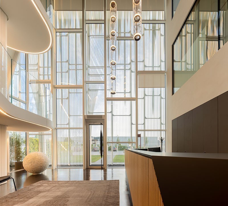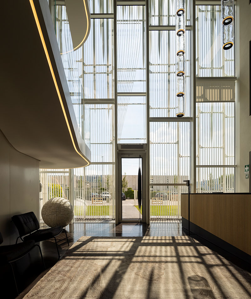 I serramenti sono proprio una delle caratteristiche che rende così particolare questo progetto, collocandosi tra gli elementi di interior design più distintivi per gli ambienti. A partire dalla forma fluida della facciata esterna: i sistemi per facciate in alluminio Schüco FWS 60 SG (Structural Glazing), con montanti in vista di soli 60 mm, sono stati vincolati su colonne verticali in acciaio per consentire la realizzazione di una facciata di 11,16 m di altezza. I tamponamenti vetrati sono stati realizzati con vetro camera isolante (10 mm vetro temprato, 20 mm Gas Argon, 66.2 mm vetro stratificato di sicurezza basso emissivo con valori di trasmittanza termica pari a Ug 1.0 W/m²K). Nella hall, le potenzialità costruttive del sistema sono state sfruttate per ottenere un gioco di incastri geometrici particolari delle vetrate, non allineando i traversi.