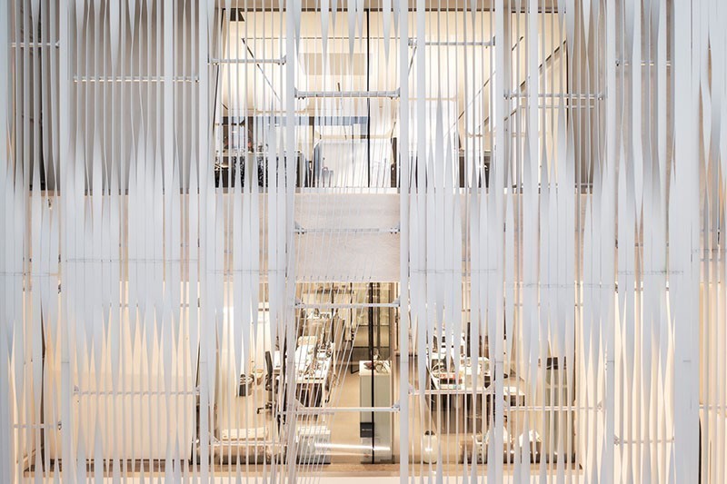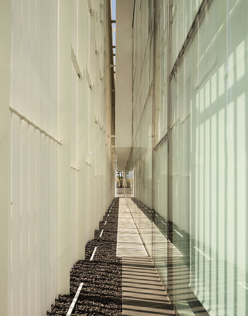 A protezione delle ampie vetrate esterne è stato studiato un sistema di oscuramento a frangisole in elementi metallici che si sviluppano a tutta altezza, avvolgendo l’edificio con un forte effetto scenico e schermandolo dai raggi solari, pur mantenendo la permeabilità visiva sull’ambiente circostante. Il disegno della parete a frangisole si ispira alle frange di pelle, proprio come quelle lavorate dall’azienda.