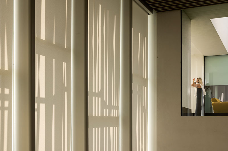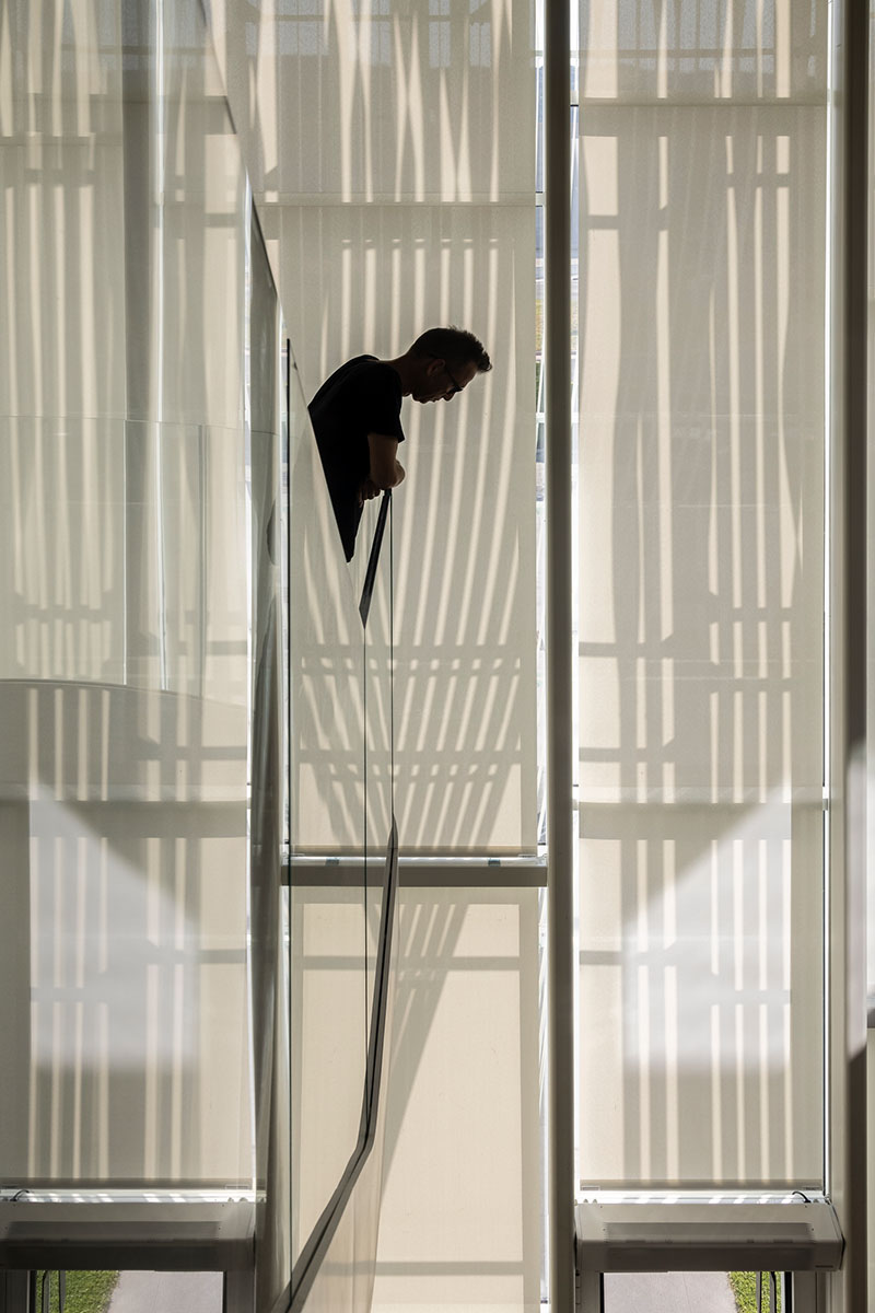 Le finestre sono motorizzate e possono essere azionate meccatronicamente per controllarne da remoto l’apertura. Il motore a scomparsa si integra interamente nel telaio del serramento, senza componenti aggiuntivi o corpo motore in vista: una caratteristica distintiva dei sistemi in alluminio Schüco che preserva la pulizia delle linee. Le finestre si possono dunque aprire con pulsante a muro o tramite app. Ciò consente una gestione efficace degli scenari e un’ulteriore attenzione nei confronti del benessere dei lavoratori: basti pensare alla possibilità di raffrescamento degli uffici nei mesi estivi semplicemente facendo aprire autonomamente le finestre la mattina presto prima dell’arrivo del personale e a quella di ventilazione programmata o collegata a dei sensori di CO2 per una qualità dell’aria sempre ottimale.