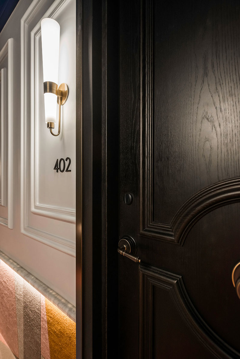 Combinata con la maniglia DND in stile rétro, la serratura dormakaba Pixel è in armonia con l’interior design e con forme e colori della porta e rappresenta una soluzione altamente moderna in quanto consente anche l’accesso tramite smartphone. Le porte delle stanze sono complete di chiudiporta dormakaba ITS 96 con guida a scorrimento invisibile. Grazie alla loro struttura compatta, i chiudiporta ITS 96 possono essere integrati praticamente in ogni porta con spessore minimo di 40 mm e la loro qualità certificata è garanzia di sicurezza.