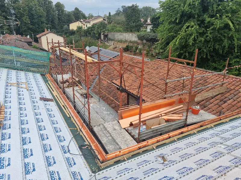 L’intervento è iniziato con la rimozione del manto di copertura esistente, seguito da un’attenta verifica dello stato del supporto ligneo sottostante, per accertare la solidità e stabilità del sottofondo. Successivamente, è stato applicato un telo barriera al vapore, essenziale per proteggere l’isolante dall’umidità proveniente dagli ambienti interni.