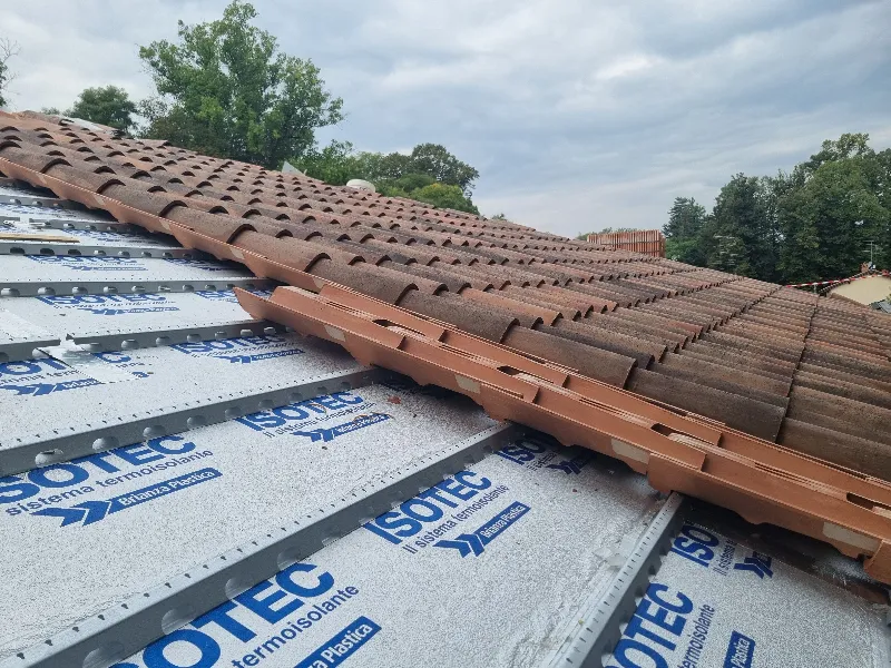 Una volta ultimata la posa dei pannelli, ed eseguiti i dettagli di realizzazione del colmo ventilato con le apposite staffe e listelli, sui correntini metallici integrati nei pannelli Isotec sono stati disposti i bicoppi di canale con dentello, scelti per la loro stabilità nel supportare i coppi di rivestimento. Infine, la copertura è stata completata con l’installazione di coppi anticati, perfettamente in linea con l’estetica storica dell’edificio, preservando il suo fascino architettonico originale.