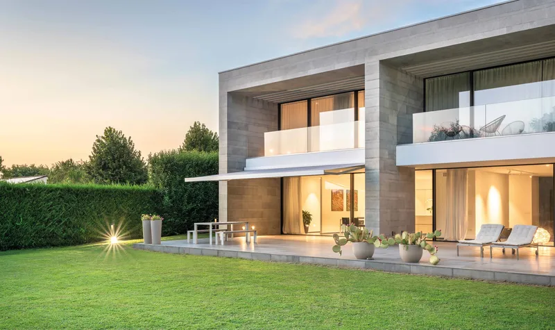 Esprime al meglio il valore e la funzionalità di questa tipologia di schermatura solare, la tenda Gibus installata in un’esclusiva residenza unifamiliare, un’abitazione che si staglia per altro come un perfetto esempio di corretta progettazione bioclimatica. Qui, infatti, le strutture murarie, la copertura aggettante e le terrazze al primo piano proteggono dall’irraggiamento diretto le ampie vetrate sulla facciata esposta a meridione, svolgendo il ruolo di frangisole fissi. La ricerca del miglior equilibrio fra luce e ombra è alla base delle relazioni dimensionali del prospetto. Disegnati secondo le regole della geometria proiettiva, i volumi massivi sono esaltati dalla dinamica dell’irraggiamento solare: favoriscono la massima permeabilità visiva fra interno ed esterno e regolano l’ingresso della luce naturale, nella zona giorno al piano terreno come nella zona notte soprastante.
