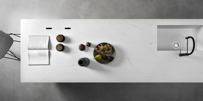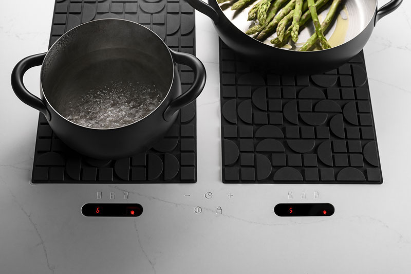 Lapitec Chef è azionato da un doppio Cooking Mat dotato di sensori magnetici, che quando posizionato sul piano, interagisce con gli induttori sotto-top e attiva i comandi touch e il sistema, per un totale di quattro aree cottura anche in modalità bridge. In assenza del Mat, invece, l’induzione e i relativi display – gli unici dettagli dell’elettrodomestico visibili sul piano in Lapitec, insieme a piccole incisioni che indicano dove posizionare il tappetino – risultano invece inattivi e garantiscono la massima sicurezza anche in presenza di bambini.