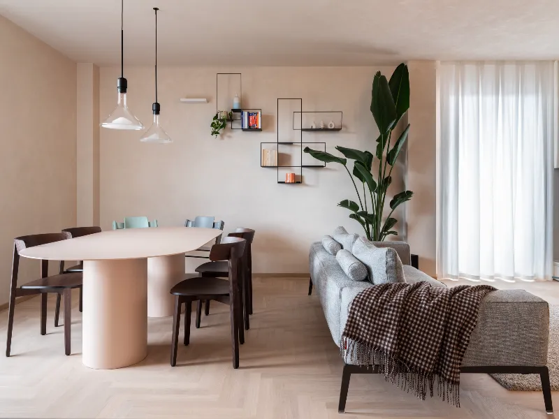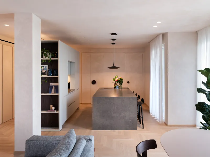 Grande attenzione è stata data alla luce naturale, amplificata da una palette neutra e calda e dal pavimento in rovere chiaro posato a spina di pesce. Le superfici delle pareti, trattate con una finitura materica dal leggero effetto “wall wash”, cambiano aspetto in base alla luce e si estendono senza soluzione di continuità su mobili e porte, creando un’architettura coerente e raffinata.