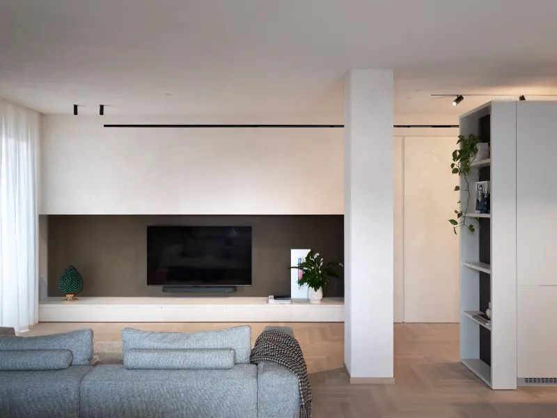 La zona d’ingresso è stata il punto di partenza dell’intervento: qui è stato creato un locale multiuso e lavanderia, accessibile da due varchi, uno nascosto in un mobile contenitore su misura che conduce alla zona giorno, l’altro diretto verso il bagno. Lo spazio si articola attorno a un blocco centrale contenitivo che divide idealmente l’ingresso dalla cucina, prolungandosi fino al mobile TV. Un unico gesto architettonico che accompagna e organizza la casa, integrando anche il sistema di aerazione con mandata e ripresa d’aria, individuabile solo attraverso un sottile taglio nero a soffitto.