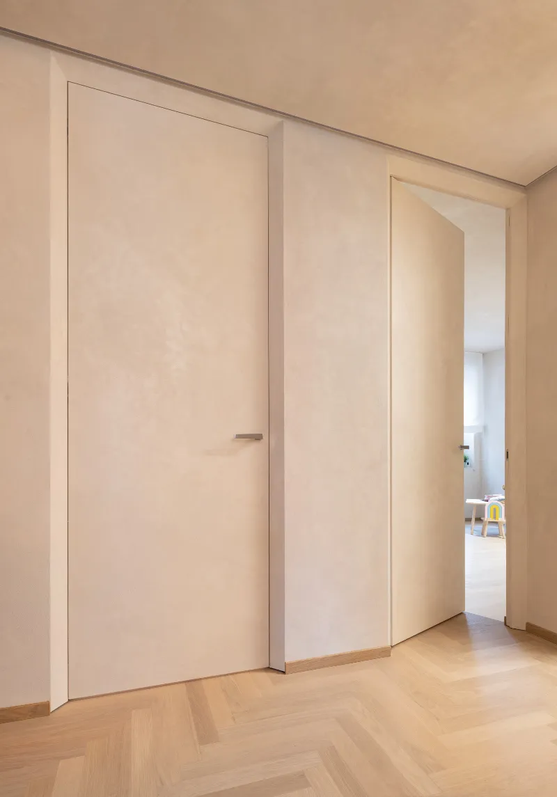 ECLISSE 40 Collection è una soluzione adottata nel disimpegno che conduce alla zona notte. Qui quattro porte con profilo inclinato a 40 gradi e altezza 240 cm disegnano un passaggio essenziale ma di grande effetto. Un controsoffitto nasconde un profilo LED continuo che sottolinea l’effetto visivo della svasatura, facendo apparire le porte come prolungamento naturale delle pareti fino al soffitto.