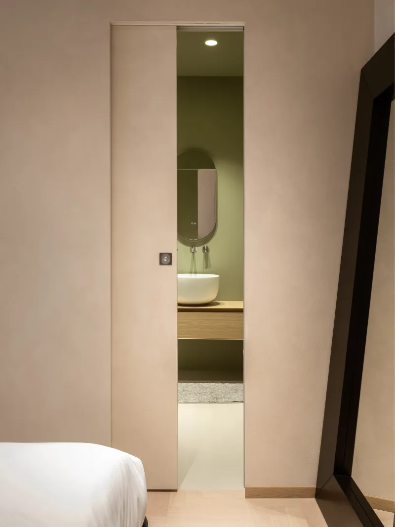La camera padronale è dotata di bagno privato e cabina armadio, entrambi accessibili tramite due porte scorrevoli a scomparsa ECLISSE Syntesis Line. Le ante, trattate sui due lati con diverse tonalità, coordinate al colore salvia delle pareti in resina del bagno, testimoniano una cura cromatica e progettuale puntuale, coerente con l’intero intervento.
