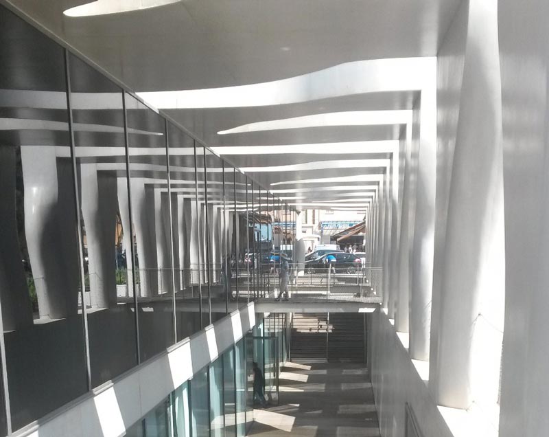 L’edificio, dalle forme organiche e meandriche, rispecchia l’universo onirico e complesso del poeta francese e, come il Mucem costruito due anni dopo a Marsiglia, dialoga apertamente con le luci e i riflessi del vicino Mediterraneo.