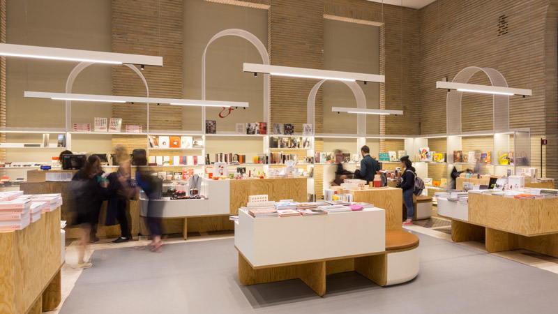 Posto al piano terra nel salone di ingresso il bookshop della Triennale è un luogo sicuro dove poter perdere un intero pomeriggio a sfogliare libri di architettura, design, grafica, moda, fotografia e arti visive.