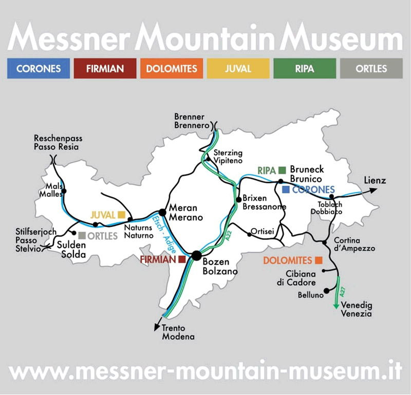 Situati in sei località del Sudtirolo e del Bellunese, i musei del circuito non sono una semplice raccolta di oggetti ma piuttosto un percorso interdisciplinare dedicato alla montagna. Oltre a trovarsi in luoghi straordinari, i singoli musei sono anche progetti di elevato valore architettonico, come il MMM Corones di Zaha Hadid o il MMM Firmian dell‘Architetto Italiano 2016 Werner Tscholl.