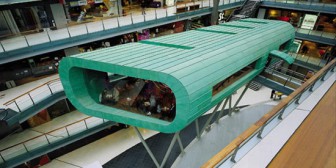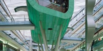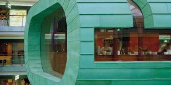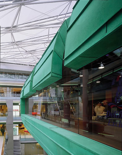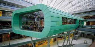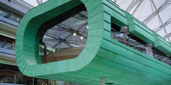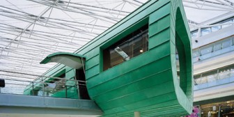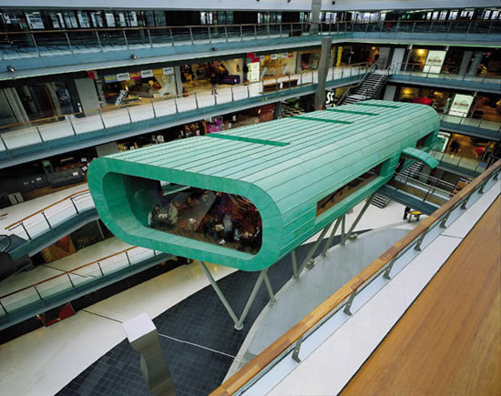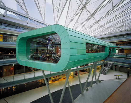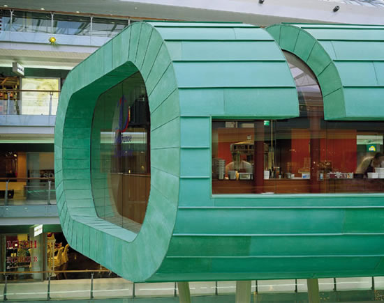 Sulla nuova “Marktplatz für Einrichtungsbedarf” (piazza del mercato dell’arredamento) di Amsterdam fluttua un oggetto rivestito con rame patinato verde marcato TECU®Patina, un progetto del designer londinese Virgile & Stone. Il corpo adibito a ristorante, simile ad un chassis di aereo, con i ponti necessari a raggiungere le gallerie del secondo piano che ricordano delle passerelle, offre una vista imponente sul padiglione centrale del sesto piano di “Villa Arena” del nuovo “super-mobilificio”, realizzato dagli architetti Benthem-Crouwel. A partire dalla sua apertura nell’aprile 2001, l’ampia superficie espositiva di 72.000 metri quadrati offre ai mobilifici dei Paesi Bassi la possibilità di presentare globalmente le proprie numerose proposte di pezzi d’arredamento e oggetti di design.