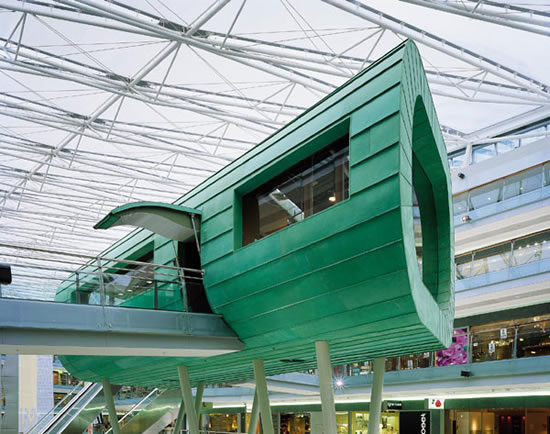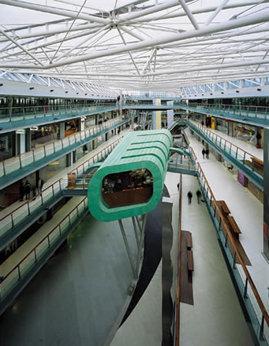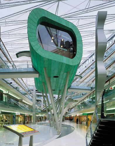 Un grosso padiglione di 3.890 metri quadrati, rivestito di 105 cuscini gonfiabili trasparenti, con la figura di un boomerang in proiezione orizzontale, viene circondato da proiezioni orizzontali di piani puntualmente contorti, che si diramano a ventaglio in un equilibrio di tensione. Il visitatore che giunge in automobile viene condotto ai parcheggi, che si sviluppano su 4 piani, tramite una rampa con accesso dalla facciata destra, da dove si gode di una vista interessante sull’edificio interno. Da Nord-Ovest si giunge a 25 metri d’altezza, tramite una scala mobile, al padiglione centrale inondato di luce. Ponti, ascensori in vetro ed altre scale mobili consentono uno sfruttamento ottimale degli spazi abitativi e degli spazi di design. Il paesaggio interno, realizzato dai designer londinesi, rende il padiglione simile ad uno spazio all’aperto, dove fare acquisti diventa un’esperienza simile ad una passeggiata.