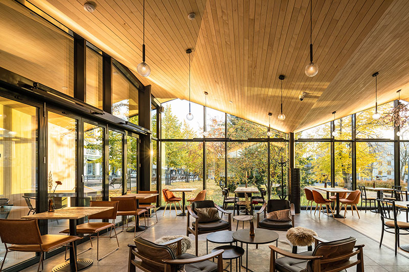 Spazi interni molto luminosi, ampie superfici vetrate e arredi in legno caratterizzano il bistrò offrendo agli ospiti la possibilità di gustare una selezione di piatti tipici della tradizione gastronomica finlandese in ambienti accoglienti, confortevoli e a contatto con la natura.