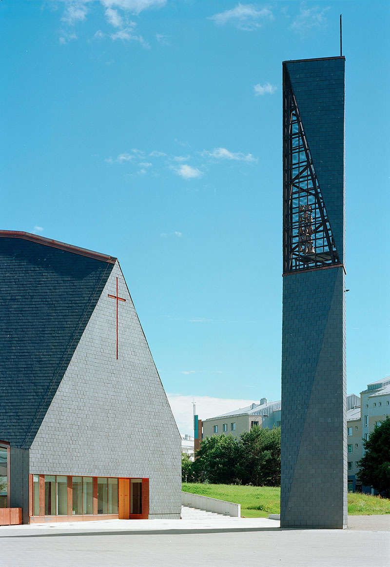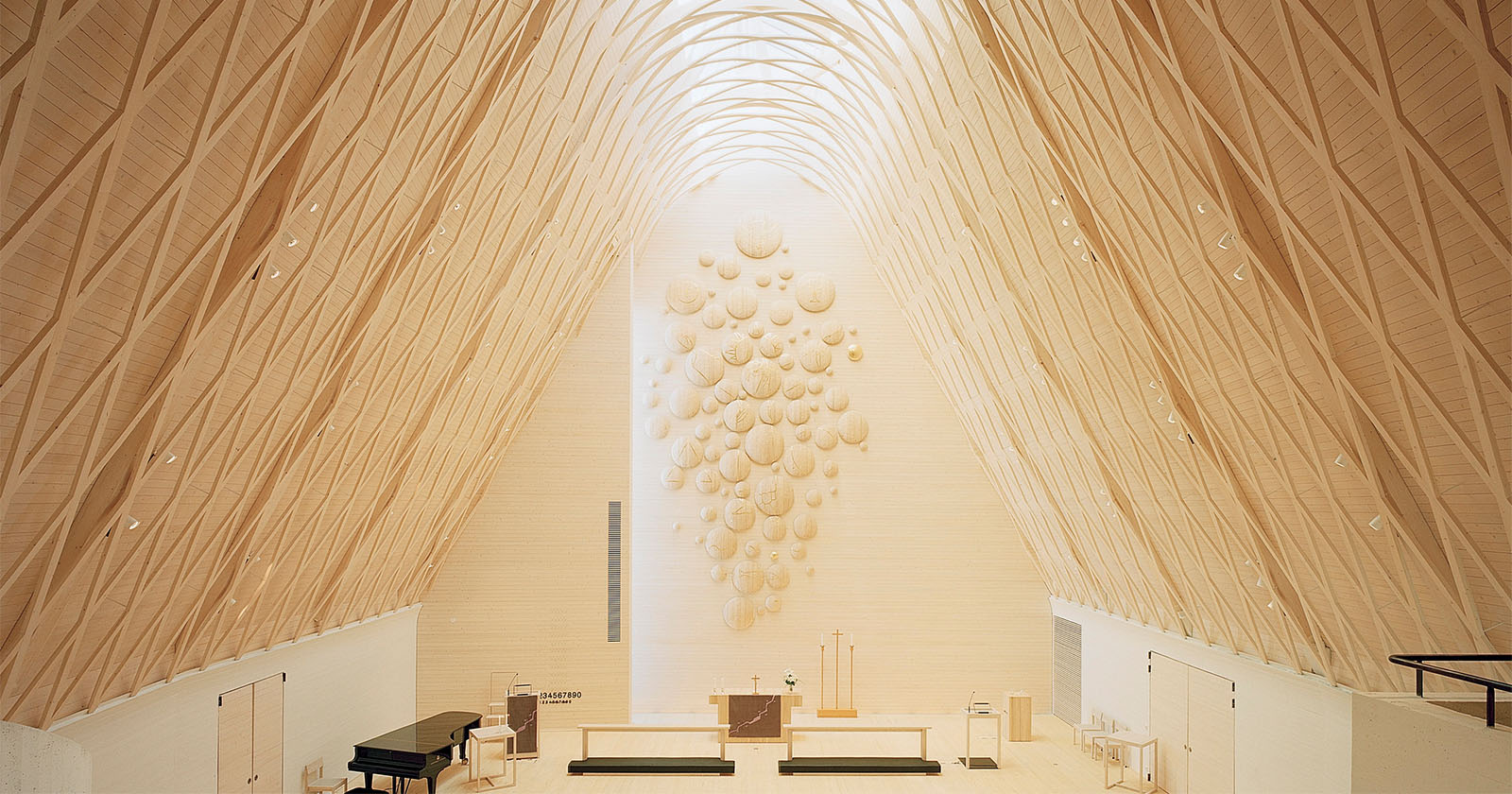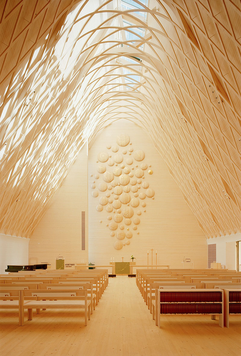 Sobrietà, semplicità e spiritualità in un mix di tradizioni costruttive locali, tecnologie all’avanguardia e materiali naturali sono i punti chiave del progetto firmato da OOPEAA Office for Peripheral Architecture. Il corpo principale della chiesa è fiancheggiato da un’ampia scalinata e da un elegante e snello campanile che diviene un punto di riferimento per il quartiere. Il calore del legno e la luce soffusa degli ambienti interni, molto sobri ed essenziali, accolgono i fedeli in uno spazio intimo e raccolto dove trovare pace e silenzio.