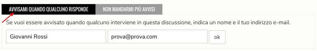 La stessa funzione si può attivare indicando un indirizzo email e uno pseudonimo nel box in calce a ciascuna discussione.