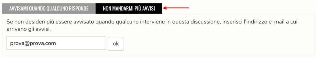 Per ricevere un avviso via email quando qualcuno risponde al nostro messaggio, si può selezionare la casella “avvisami per email quando qualcuno risponde”. In caso di risposte si riceve un avviso che riporta gli ultimi post inseriti e rimanda alla discussione sul sito.