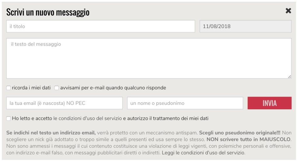 Oltre al titolo e il testo del messaggio, è richiesto un nome (o uno pseudonimo) e un indirizzo email per indicare chi scrive. Non è richiesta nessuna registrazione preventiva agli utenti.