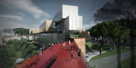 Trait d’union delle aree è un percorso verde sul quale si innestano i corpi degli edifici con diversi orientamenti ai vari livelli. Il nuovo complesso sviluppa l’idea di generare nella città un segno che, lavorando a diverse scale e in diverse forme, sia in grado di offrire la possibilità di ulteriori future espansioni.