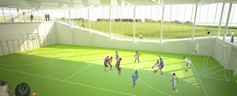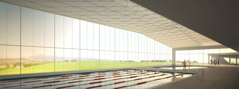 Il nuovo complesso presenta un legame forte con l’orografia del parco Radicelli in un gioco di piani orizzontali e inclinati che hanno come risultato l’integrazione tra il parco e il nuovo quartiere. Il nuovo edificio, che contiene i diversi elementi del complesso sportivo (2 piscine, palestra polivalente per competizioni sportive, club house, sala riunioni) parzialmente interrato, si dissolve in piani stratificati a sottolineare la relazione con il paesaggio.