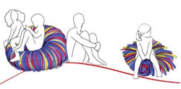 Poltrona/pouf che prende spunto dalla tecnica dei pompons in tessuto, qui proposti in versione oversize. Una seduta “alternativa”, leggera, di dimensioni ridotte da posizionare in qualunque ambiente interno e realizzata con filato ottenuto dalla lavorazione di scarti di tessuto.
