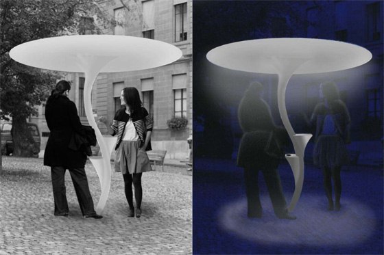 E’ una struttura sotto cui potersi riparare dal cattivo tempo o quando fa molto caldo. Sotto i suoi 230 centimetri di diametro, possono ripararsi fino a sette persone. Questo rifugio è stato inizialmente progettato per i fumatori, ormai banditi dai luoghi pubblici. Dopo il crepuscolo, l’oggetto si illumina, creando un’atmosfera rassicurante nel rispetto dell’ambiente; esso utilizza, infatti, dei pannelli solari installati sul tetto. Un bracciolo e un posacenere sono, inoltre, integrati nella base della struttura.